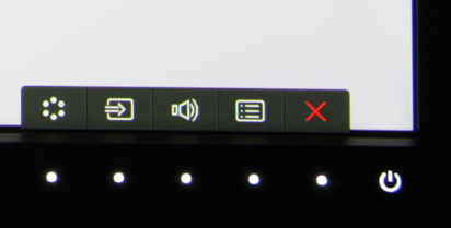 Если монитор выключен, но подключен к электрической сети и включен механической кнопкой включения, то кнопка питания начинает подсвечиваться белым при приближении к ней руки пользователя. Если к ней прикоснуться, то монитор включается, подсветка кнопок тоже включается и затем выключается через какое-то время. Индикатор состояния (он же значок на кнопке питания) неяркий, он продолжает светиться белым при работе, мигает красным в режиме ожидания и не горит, когда монитор выключен. Если монитор включен и работает, то подсветка кнопок управления также загорается при приближении руки. При первом прикосновении к кнопкам на экран выводится стартовое меню в виде пяти иконок точно над кнопками.