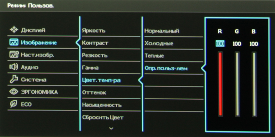 Присутствуют стандартные настройки: Яркость, Контраст, Резкость (контурная резкость), Цвет. темп-ра (цветовая температура, выбор из трех профилей или ручная регулировка интенсивности трех цветов), Гамма (пять значений), Оттенок и Насыщенность.