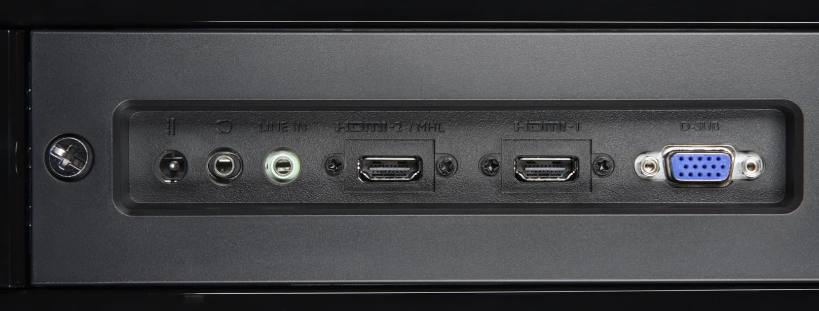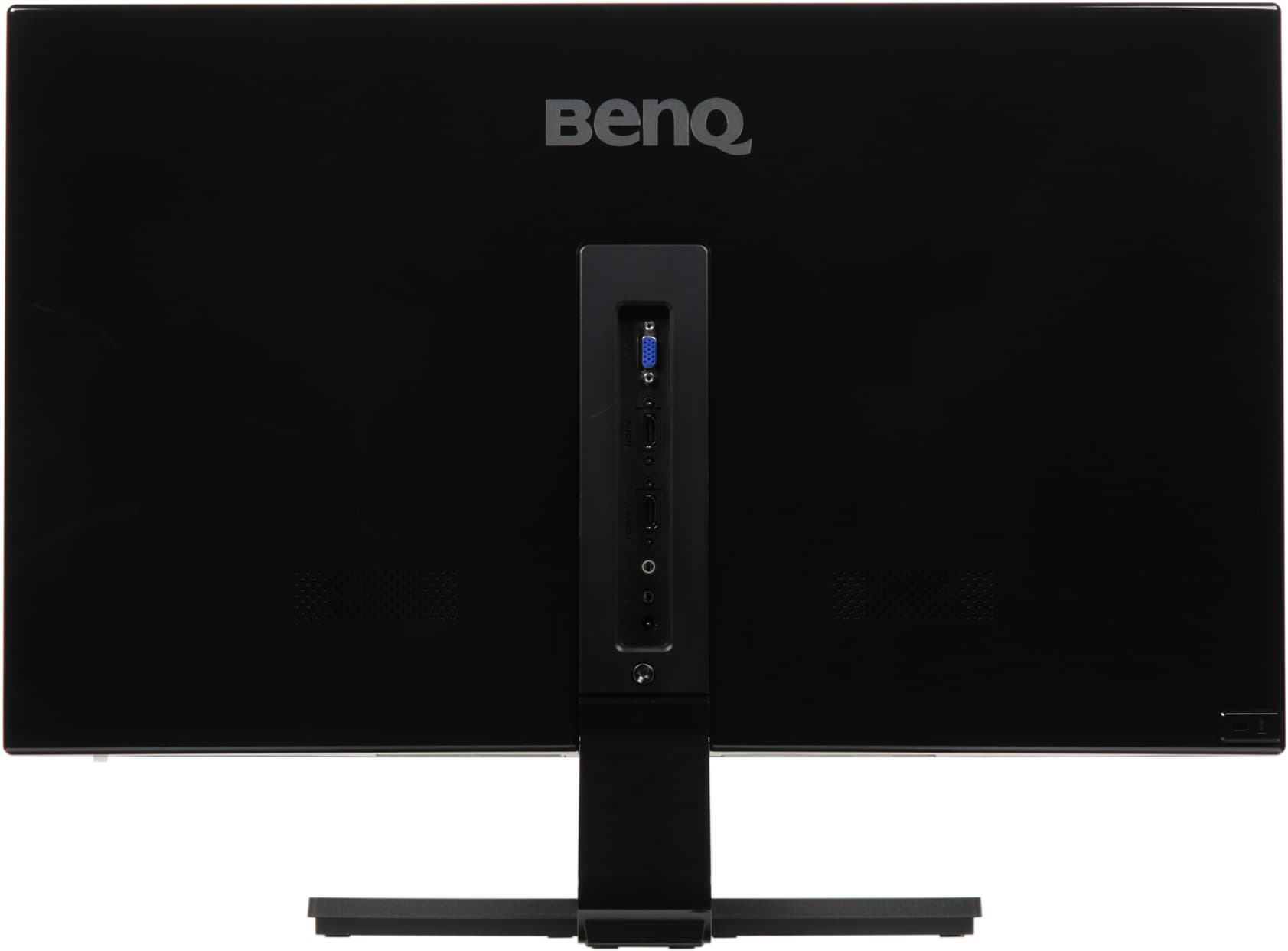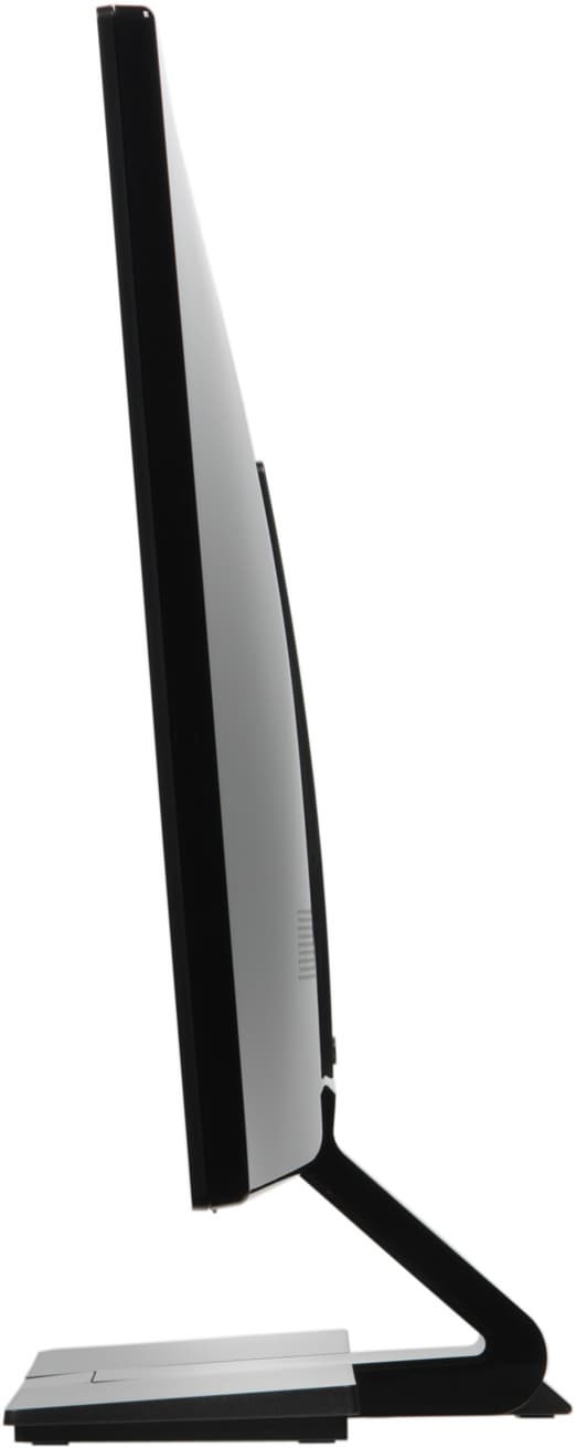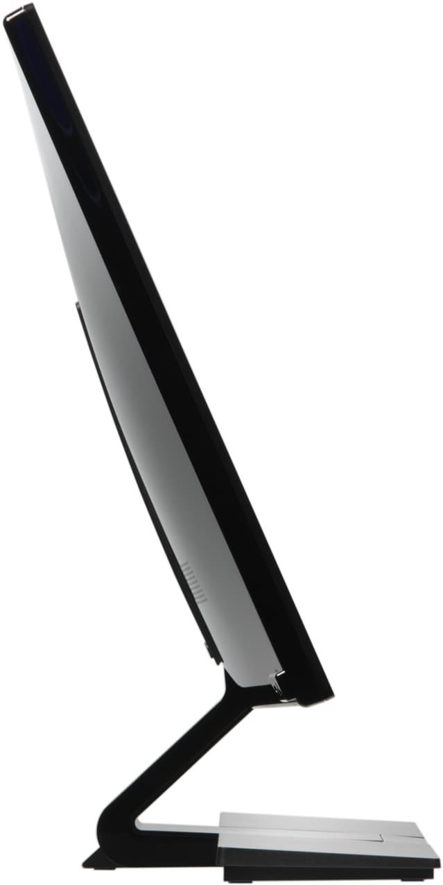 Ориентированы разъемы от плоскости экрана и повернуты на 90° (про которые это можно сказать) относительно привычной ориентации. В итоге они поместились на узкой вертикальной панельке, являющейся как бы продолжением стойки подставки. Дизайнеры экспериментируют. Подключать кабели к разъемам относительно удобно, но подписи (просто выдавленные в пластике) к разъемам практически нечитаемые, а в данном случае их нужно читать, так как только один из двух HDMI поддерживает MHL. В нижнем углу на задней панели можно найти разъем для кенсингтонского замка. За двумя симметрично расположенными решетками на задней панели распложены миниатюрные громкоговорители овальной формы. Верхний шарнир допускает немного наклонять блок экрана вперед от вертикального положения, больше — назад.