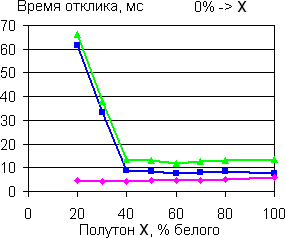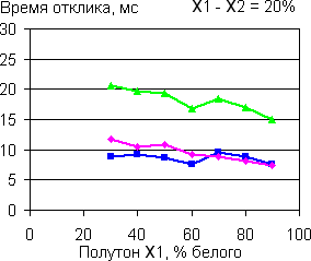 | Времена отклика при переходе между полутонами с разницей 20%. | |