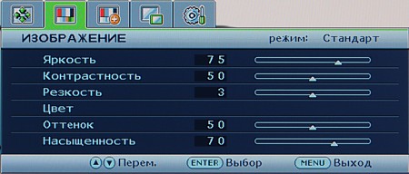 Настраивать можно: яркость, контрастность, контурную резкость, цветовую температуру (три профиля и ручной баланс), оттенок и насыщенность (последние две настройки недоступны при DVI и VGA-подключении).