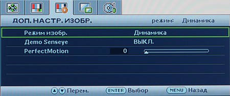 Еще есть четыре профиля цветокоррекции. Для наглядной оценки того, как они влияют на изображение, можно включить режим Демо Senseye — в одной половине экран будет работать профиль Стандарт, в другой — выбранный. Для просмотра динамических сюжетов производитель рекомендует включить режим PerfectMotion (три уровня), что и при этом происходит, расскажем далее.