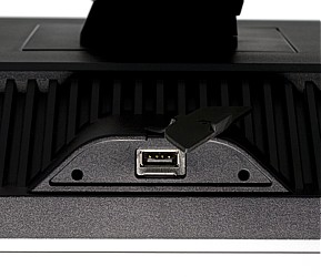 Там же — обозначения кнопок. Пользоваться кнопками неудобно, на ощупь ориентироваться в них сложно, приходится подглядывать сбоку, но тогда не видно, что происходит на экране. Вынесение обозначений на фронтальную поверхность значительно упростило бы использование кнопок, не сильно при этом ухудшив внешний вид монитора. На площадке в центре верхней кромки расположен USB-порт, прикрытый резиновой заглушкой.