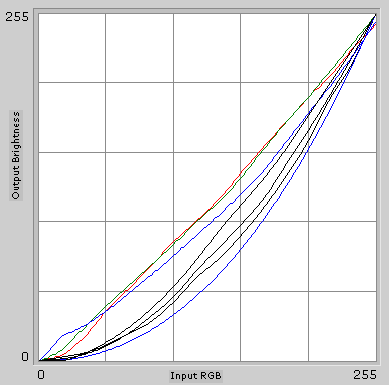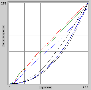 Для 4-х сочетаний настроек контрастности и яркости приведены графики гамма-кривых, где можно увидеть, насколько гамма-кривые индивидуальных цветов (черные линии) отклоняются от целевой гамма-кривой (синяя линия) и какая требуется коррекция для каждого цвета (соответственно красная, синяя и зеленая линии).