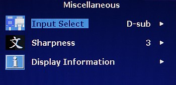Кнопка с символом i служит для вызова функции автоподстройки. Быстрый доступ к некоторым страницам меню возможен с помощью кнопок Exit (выбор источника сигнала — D-sub или DVI), «влево» и «вправо» (настройка контрастности и яркости, соответственно). Цветовой баланс настраивается или выбором одного из трех предустановленных профилей (названных как Bluish, Reddish и sRGB), или ручной настройкой яркостей красного, зеленого и синего цветов.