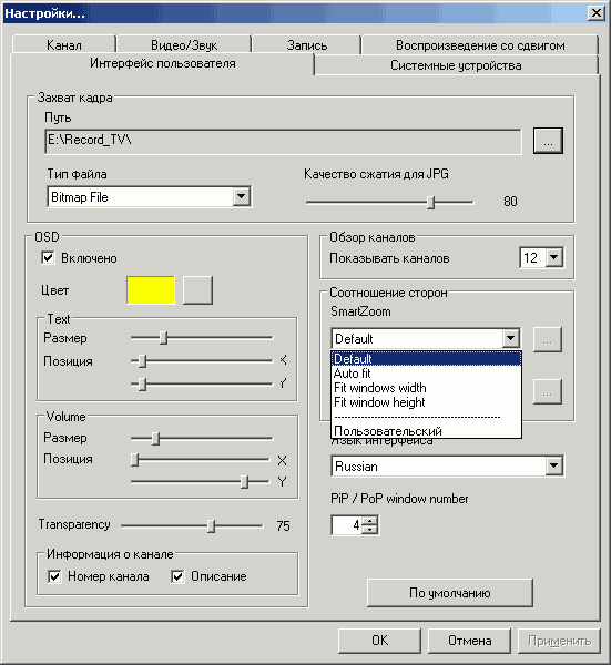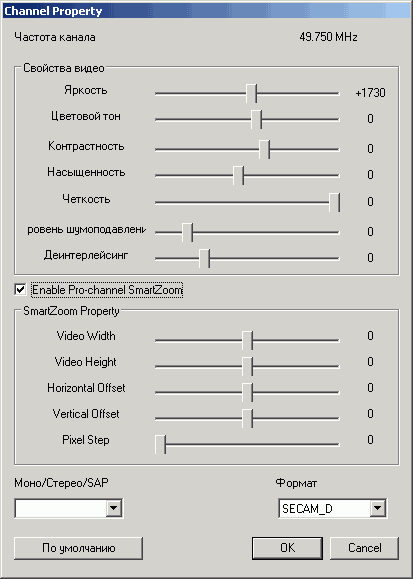 Список индивидуальных настроек (кнопка Пользовательские настройки в столбце справа от названий каналов) для каждого канала включает в себя яркость, цветовой тон, контраст, насыщенность, чёткость, стандарт цветности, формат звука, шумоподавление, деинтерлейсинг и настройку масштабирования, позволяющую избежать краевых артефактов при просмотре. Ползунок, регулирующий степень шумоподавления, отвечает за работу программного алгоритма, выделяющегося среди конкурирующих решений хорошей эффективностью. Большой диапазон индивидуальной настройки деинтерлейсинга является фикцией, заметными можно назвать только отличия между работающим деинтерлейсингом при любой позиции ползунка и его полным отключением.