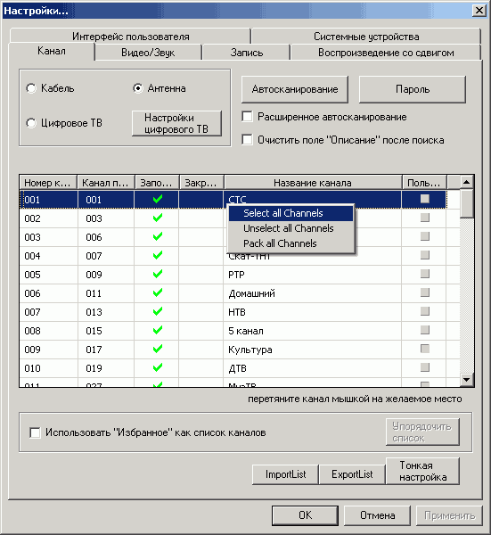 - настройка расположения каналов в списке;
