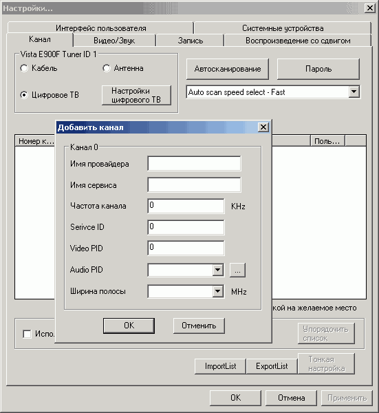 Кнопка Настройки цифрового ТВ в меню Канал вызывает настройки поиска DVB-T каналов.