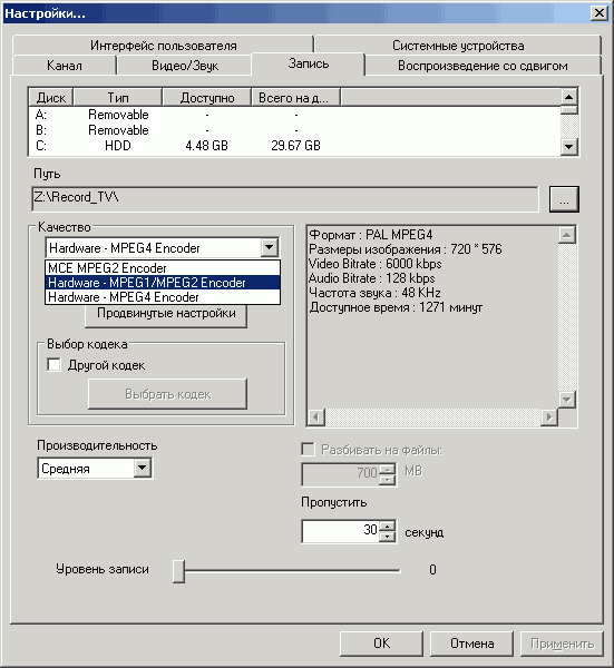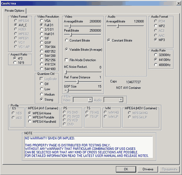 При программной записи в MPEG2 доступны 4 предустановленных профиля (PAL DVD, PAL PC MPEG2, PAL VCD и PAL 1/4 DVD) и один пользовательский. При аппаратном кодировании в MPEG2 место пользовательского занимает PAL SVCD. Это не означает, что нельзя изменить настройки, однако изменение организовано не самым удобным образом. Для установки разрешения необходимо выбрать один из стандартных профилей, после чего путём обращения к дополнительным настройкам (кнопка Продвинутые настройки) изменить частоту кадров, видеобитрейт (постоянный и переменный, от 200 кбит/c до 10 Мбит/с), аудиобитрейт (от 64 до 384 кбит/с) и частоту дискретизации (44.1 и 48 кГц).