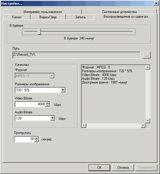 Настройки параметров отложенного просмотра Timeshift (сжатие в MPEG2 осуществляется силами аппаратного кодировщика) допускают выбор разрешения, аудио- и видеобитрейта, максимальное время буфера, исходя из доступного места на жёстком диске, а также интервал пропуска при перемотке.
