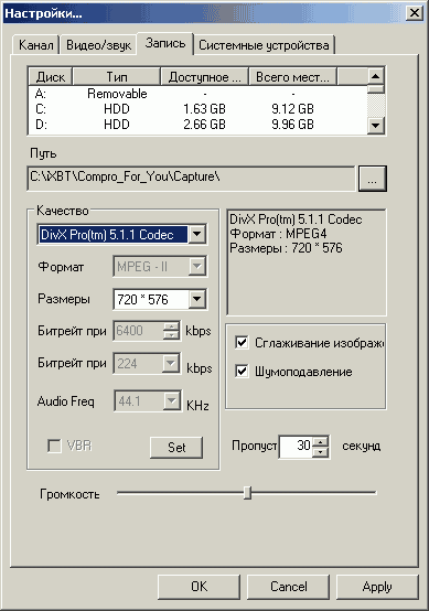 В разделе записи появилась поддержка MPEG-4 с возможностью настройки параметров кодека (кнопка Set). Отметим, что шумоподавление при записи осуществляется силами TVP5150AM1.