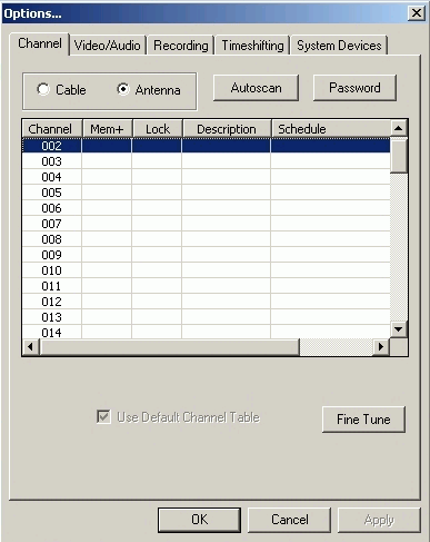 и попадаем в закладку Channel меню Options, ответственную за выбор диапазона (антенный или кабельный) и настройку каналов.