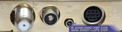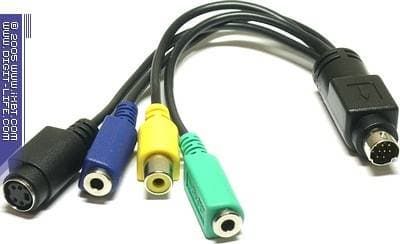 - Переходник Mini-DIN 9-pin — S-Video (вход) + RCA (композитный видеовход) + mini-jack (аудиовход) + mini-jack (аудиовыход)