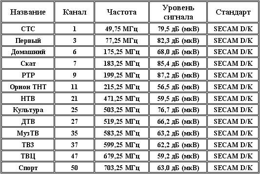 Список эфирных каналов при тестировании