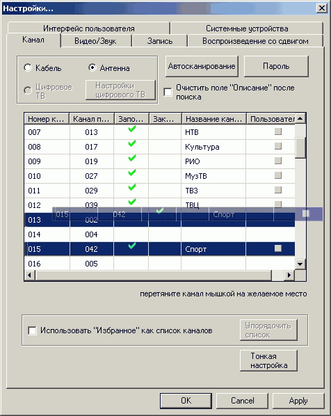 Осталось реализовать поиск по частоте и объединенный список антенных и кабельных каналов, после чего любые претензии к этой части работы штатного ПО можно будет считать необоснованными. Мы не раз отмечали скорость и точность сканирования полупроводниковых ВЧ-модулей от Xceive. Поиск обнаружил все мои реально существующие каналы.