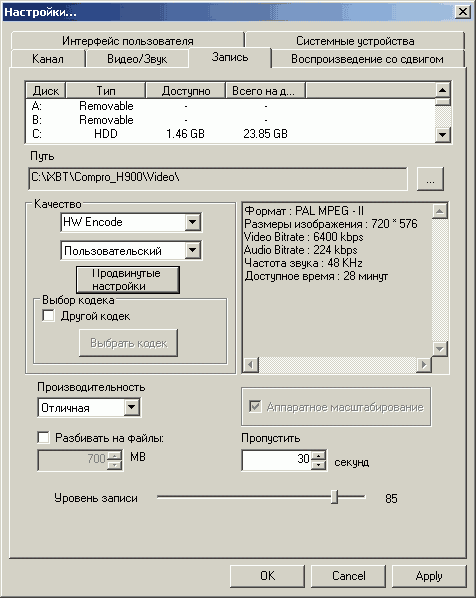 - Программная поддержка сторонних кодеков при записи
