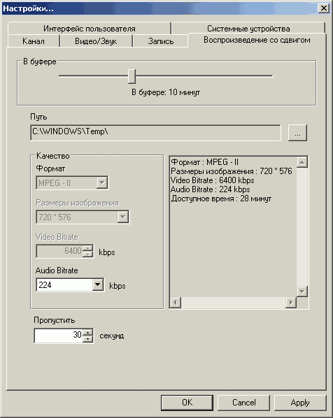 В настройках отложенного просмотра Timeshift для изменения доступен только аудиобитрейт, остальные параметры заблокированы на 720×576 6400 Кбит/с. Щедро, конечно, иногда не помешало бы и уменьшить.