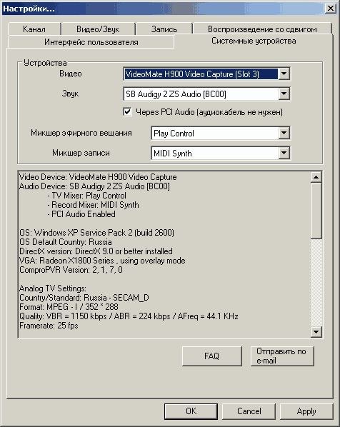 Нареканий на качество звука не возникло. За исключением отсутствия настроек имеющегося в CX23418 трёхполосного эквалайзера, конечно. Остаётся надеяться на их появление в следующих версиях программы.Нет претензий и к стабильности работы как с Compro PVR 2, так и со штатным интерфейсом Windows XP Media Center Edition 2005. Хотя, отсутствие в актуальной на момент тестирования версии драйвера автоопределения системы цветности может создать определённые неудобства при использовании этой OS в сочетании с вещанием в разных стандартах.