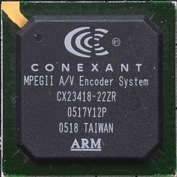 Как мы уже говорили, на плате установлен 10-битный АЦП+MPEG1/2-энкодер Conexant CX23418. Чип имеет ревизию 22ZR. Теоретически, возможности CX23418 почти не отличаются от широко распространённой связки CX2584x+CX23416. Разве что, уменьшен максимальный битрейт при кодировании звука — 384 кбит/с против 448 кбит/с. Впрочем, как для аналогового телевидения, так и для захвата с внешних устройств даже 384 кбит/c в большинстве случаев является избыточным значением. Кроме того, для CX23418 заявлена поддержка коррекции временных искажений Time Base Correction (TBC). Данная технология предназначена для уменьшения горизонтального дрожания, вызванного неравномерностью движения плёнки, что позволяет получить лучшие результаты при захвате с видеокассет. Однако не будет делать поспешных выводов, соответствующий параметр имеется и в драйвере CX23416, несмотря на отсутствие упоминания о нём в описании чипа.