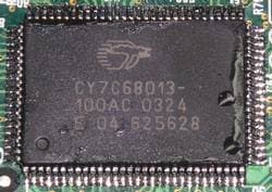 Радиатор, расположенный рядом, скрывает контроллер USB 2.0 CY7C68013 от Cypress Semiconductor.