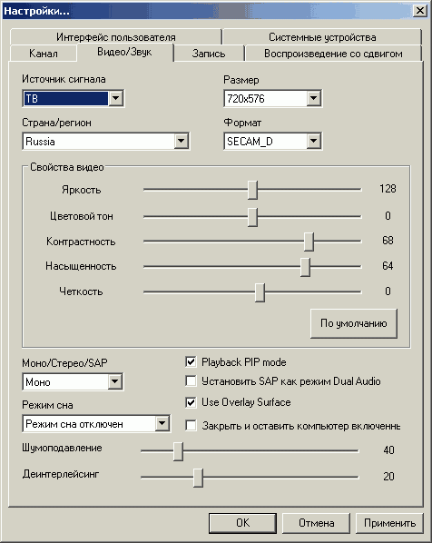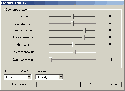 В список индивидуальных настроек для каждого канала входят яркость, цветность, контрастность, насыщенность, чёткость, стандарт цветности, шумоподавление и деинтерлейсинг. Ползунок, регулирующий степень шумоподавления, отвечает за работу программного алгоритма. Несмотря на большой доступный диапазон, индивидуальная настройка деинтерлейсинга позволяет заметить отличия лишь между двумя режимами — работающим деинтерлейсингом и его отключением.