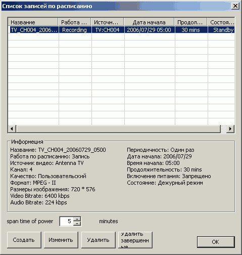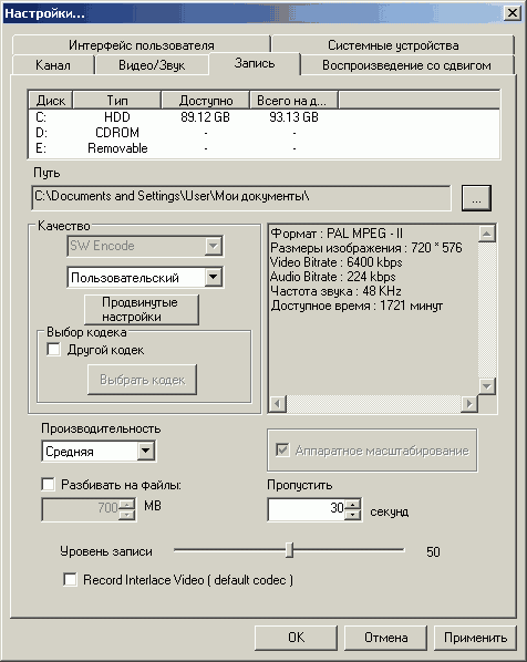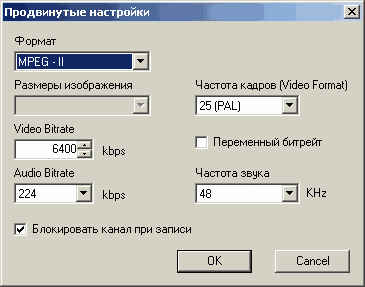 Кроме того, в этом разделе можно найти уровень звука при записи и недавно появившуюся возможность записи прогрессивного/чересстрочного видео при кодировании в MPEG2 штатным кодеком. Для ручной настройки этого кодека доступны аудио- и видеобитрейт (постоянный CBR или переменный VBR) и частота дискретизации звука. Здесь же расположен чекбокс блокировки канала при записи.