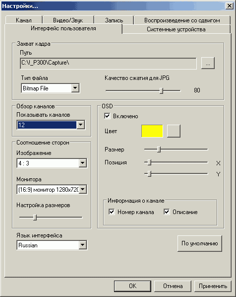 В разделе настроек пользовательского интерфейса можно изменить размер, цвет и расположение экранного меню, выбрать формат захвата кадров (bmp и jpeg) и размер матрицы для режима предварительного многоканального просмотра. Опции масштабирования и возможность настройки пропорций оконного и полноэкранного режимов в случае с PCMCIA-тюнером являются насущной необходимостью.