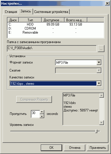 Запись в MP3 возможна с максимальным битрейтом 224 Кбит/с. Частота дискретизации при записи в FM-режиме зафиксирована на 32 кГц.