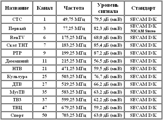 Список эфирных каналов при тестировании