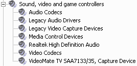 После установки в разделе Sound, video and game controllers появляется устройство VideoMate TV SAA7133/35, Capture Device.