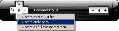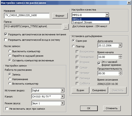 В цифровом режиме возможна запись в MPEG2 файл, запись транспортного потока и звуковой дорожки отдельно.