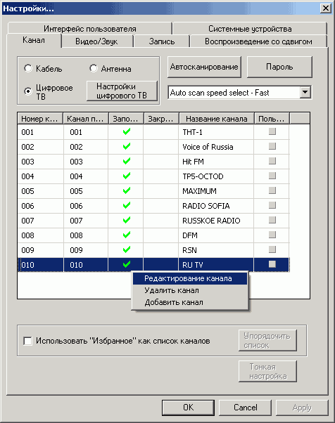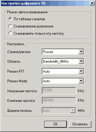Кнопка Настройки цифрового ТВ в меню Канал вызывает настройки поиска DVB-T каналов. Программа предоставляет пользователю возможность тонкой настройки параметров сканирования. Поиск возможен по региону, заданному диапазону и в пределах одной частоты в трёх режимах чувствительности.