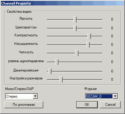Поддерживаются индивидуальные настройки параметров видеоизображения (яркость, цветность, контраст, насыщенность, чёткость, шумопонижение, деинтерлейсинг, масштабирование) и стандарта цветности для каждого канала (колонка Пользовательский). Изменение чёткости, уровня шумоподавления и деинтерлейсинга доступны только для аналоговых каналов.