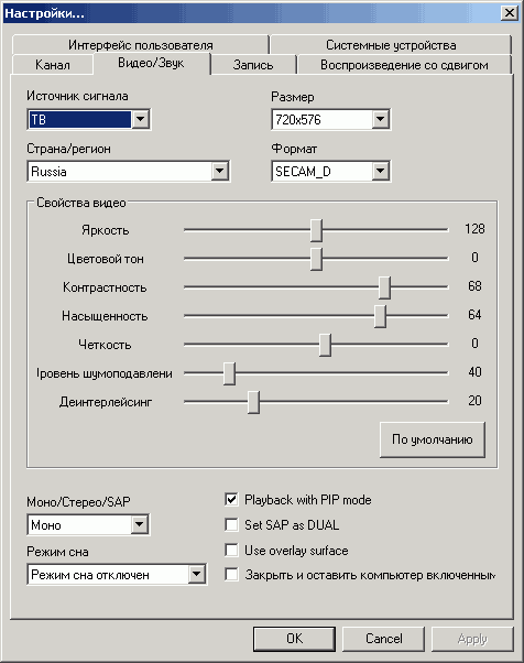 Общие настройки яркости, контраста, цветности, насыщенности, чёткости, деинтерлейсинга и программного шумопонижения, относительно которых изменяются индивидуальные, и выбор Моно/Стерео/SAP находятся в разделе Видео/Звук. Здесь же можно найти включение/отключение режима воспроизведения видефайлов в отдельном окне, включение/отключение оверлейной поверхности (при отключении используется Video Mixing Renderer) и таймер сна (до 2 часов с интервалом 30 минут).
