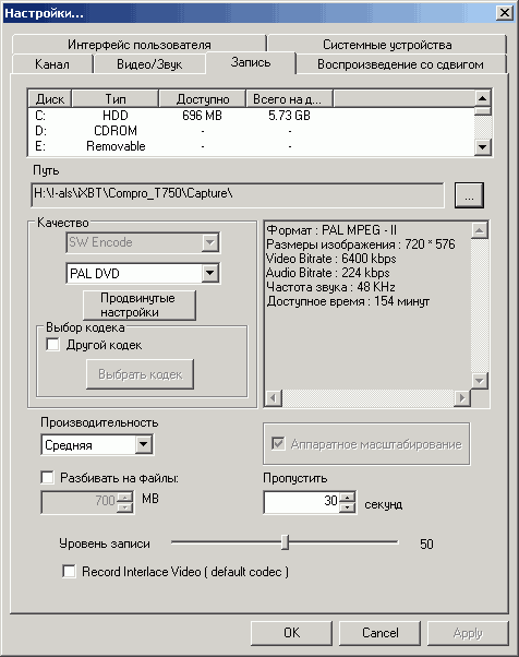 Стандартным форматом записи является MPEG1/2 с доступом к настройкам разрешения, аудио- и видеобитрейта (постоянный и переменный) и частоты дискретизации (44.1 и 48 кГц). Максимальный видеобитрейт составляет 10 Мбит/с, в наличии 4 предустановленных профиля (PAL DVD, PAL 1/4 DVD, PAL VCD и PAL 1/2 DVD) и один пользовательский.