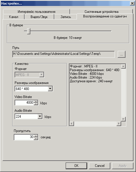 В настройках режима отложенного просмотра (в аналоговом режиме используется MPEG2, в цифровом параметры соответствуют параметрам принимаемого потока) можно найти выбор разрешения, аудио- и видеобитрейта, максимальное время буфера и интервал пропуска при перемотке.