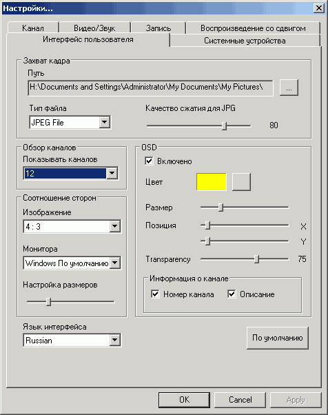 В разделе настроек пользовательского интерфейса можно изменить размер, цвет и расположение экранного меню, настроить масштабирование, выбрать формат захвата кадров (bmp и jpeg) и размер матрицы для режима предварительного многоканального просмотра (12 или 16 каналов). Реализовано несколько вариантов соотношения сторон изображения (4:3, 16:9, 16:10, пользовательское) и коррекция пропорций с учётом соотношения сторон монитора — (по умолчанию, 4:3, 5:4, 16:9, 5:3).