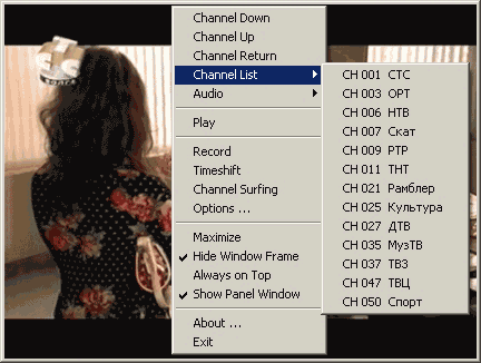 В контекстном меню, вызываемом по правой кнопке мыши, притаилась функция отключения рамки видеоокна, после чего экран с изображением принимает вид, привычный пользователям программы Fly 2000 TV.