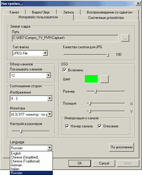 ComproPVR 2 является мультиязычной программой, практически безупречный русский перевод выполнен украинским партнером Compro Technology — компанией K-Trade Ltd. Сейчас идет работа над украинским интерфейсом.