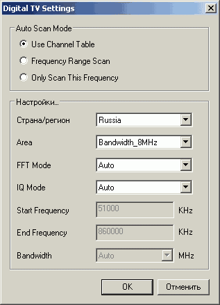 Кнопка Digital TV Settings в меню Канал вызывает настройки поиска. В отличие от программ многих производителей, ComproDTV 2 предоставляет пользователю возможность тонкой настройки параметров сканирования. Поиск возможен по региону, заданному диапазону и в пределах одной частоты