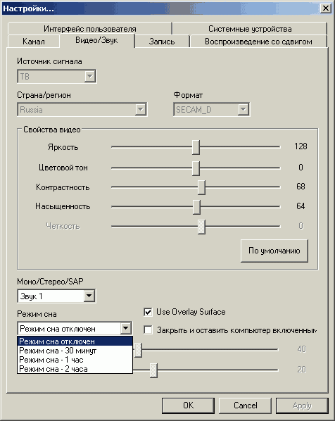 Общие настройки яркости, контраста, цветности, оттенка и чёткости находятся в разделе Видео/Звук. Настройка Mono/Stereo/SAP позволяет выбрать звуковую дорожку (при наличии нескольких вариантов).