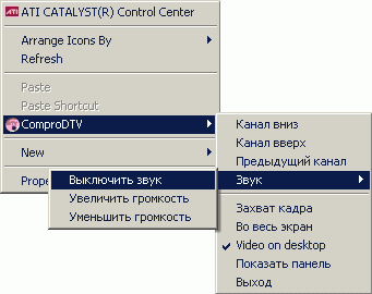 Очень оригинально организовано управление программой в режиме вывода видеоизображения на поверхность рабочего стола. В системное контекстное меню добавляется соответствующий пункт, позволяющий обойтись без панели управления, значка в системном трее и прочих ухищрений.
