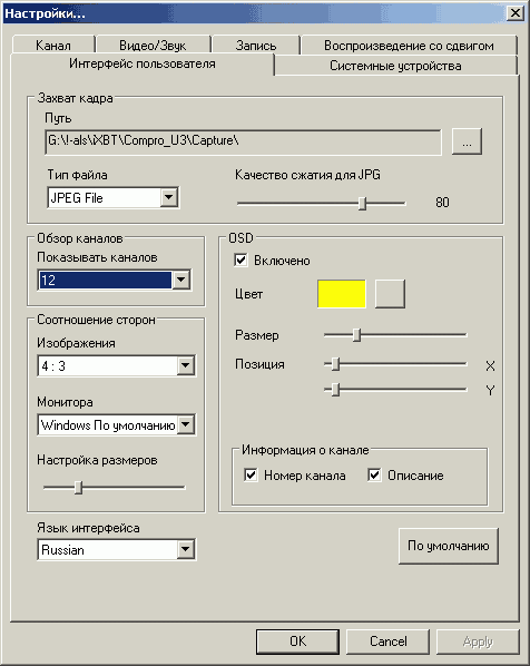 В разделе Интерфейс пользователя можно настроить размер, цвет и расположение экранного меню, выбрать формат захвата кадров (BMP и JPEG) и размер матрицы для режима предварительного многоканального просмотра. Опция Настройка размеров отвечает за масштабирование изображения при просмотре. Владельцам LCD-мониторов предоставляется возможность оценить настройку пропорций полноэкранного режима.