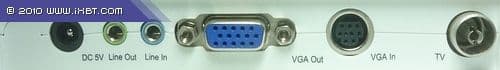 На задней панели находятся разъём питания, линейный вход, линейный выход (оба mini-jack 3.5 мм), разъёмы для подключения к монитору (D-Sub female для исходящего сигнала и 9-pin MiniDIN для входящего) и антенный разъём IEC.