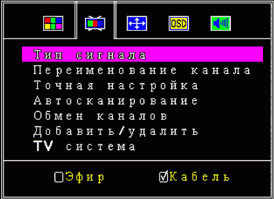 Вторым пунктом идёт раздел настройки и сортировки каналов. Тип сигнала позволяет выбрать антенный или кабельный диапазон.