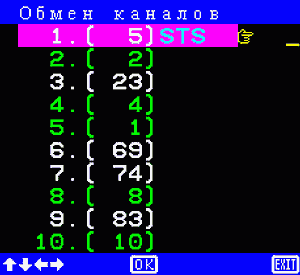 Допускается переименование каналов (название может состоять из 5 букв или цифр, русский язык не поддерживается, для ввода используется четырёхпозиционный джойстик пульта ДУ, кнопка «вниз» отвечает за перемещение вперёд по алфавиту).