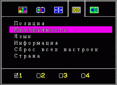 Раздел OSD позволяет настроить положение экранного меню, прозрачность (4 градации), язык (русский, украинский, английский) и предоставляет информацию о версии прошивки (1.8P у нашего экземпляра). Здесь же находятся сброс всех настроек и выбор региона — России либо Украины. Время отображения меню на экране не настраивается, что компенсируется относительно комфортной задержкой по умолчанию.