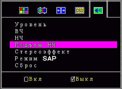 Раздел аудиопараметров содержит настройки уровня громкости, тембра высоких и низких частот, включение/выключение режима Dynamic Bass Boost (Подъём НЧ в русскоязычном варианте), включение псевдостереоэффекта при монофоническом звуке и активацию режима SAP при наличии нескольких звуковых дорожек. Не забыт и возврат к звуковым настройкам по умолчанию.