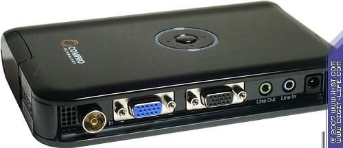 На задней панели расположены антенный IEC разъём, входной и выходной VGA-разъемы, линейный аудиовход и аудиовыход (оба mini-jack 3.5 мм) и разъём для подключения блока питания.