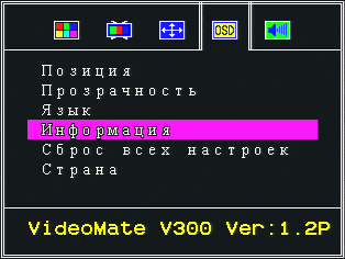 В настройках экранного меню находятся регулировка его положения, прозрачность (4 градации), язык (русский, украинский, английский), информация о версии прошивки (1.2P у нашего экземпляра), сброс всех настроек и выбор страны. Список доступных регионов претерпел некоторые изменения, в него входят три региона — Россия, США/Канада и Украина. Время отображения меню на экране не настраивается, что компенсируется относительно комфортной задержкой по умолчанию.
